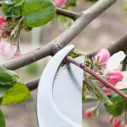 りんごを実らせる養分を蓄える葉。どの枝の葉にも太陽の光が届くよう冬の間に余分な枝を落とします。細い枝や曲がった枝を取り除き、これからりんごが実る場所を想像して育つ空間を確保する最初にして一番大切なステップです。太く伸びた枝に最高のりんごを実らせるため、木1本1本の個性を理解し作業を進めます。