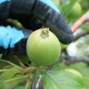 果実を間引く摘果(てきか)作業は、一番摘果と二番摘果に分かれます。まだ実が小さいうちに行う一番摘果。花摘みを経て、夏に向け徐々にりんごが実り始めますが、未成熟の実を摘み取ることで、大きな実へ養分を集中させます。さらに大きく成長した実を厳選して間引く仕上げの二番摘果を、その後1ヶ月ほどかけて行います。